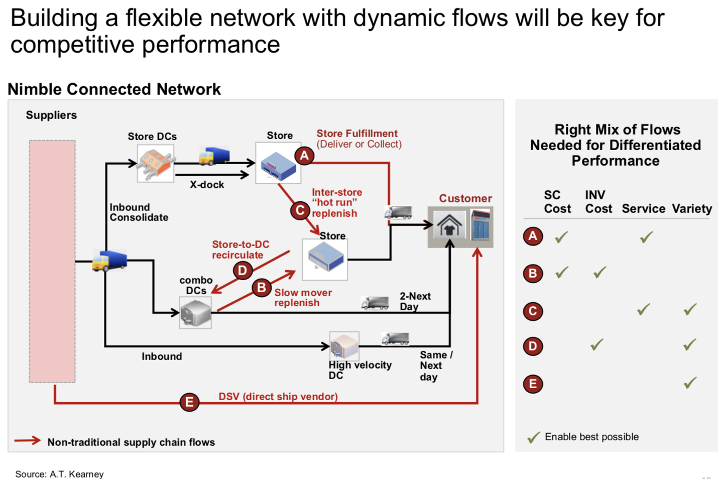 In a future, retailers will need to transform their channel specific, inflexible supply chain into flexible omnichannel flows to push the performance frontier in terms of cost, turns and service tradeoffs. DCs should have the capability to pick, pack and ship any orders (eaches and case) regardless of their destination (home, stores, other DCs. The entire network is multi-tiered. The reconfigured fulfilment assets are powered by one-view inventory and smart replenishment decision systems to enable flexible, dynamic flows. Trucks making milk runs from DCs to stores reroute their order drop-off points. Slow moving SKUs are picked up from stores and returned to the regional DCs and other stores for improved turns. Demand shaping logic allows shoppers to choose between higher-priced fast delivery or free-shipping slower delivery options.