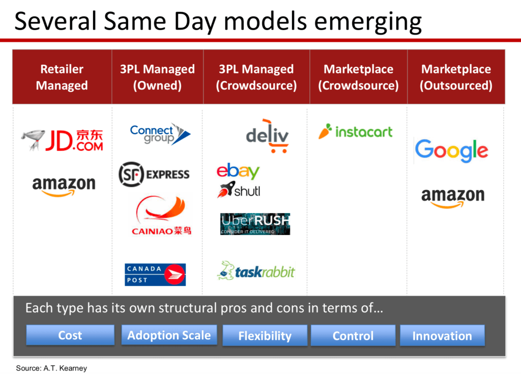 We discussed the underlying supply and demand side drivers of same day delivery and emerging models (see figure below).