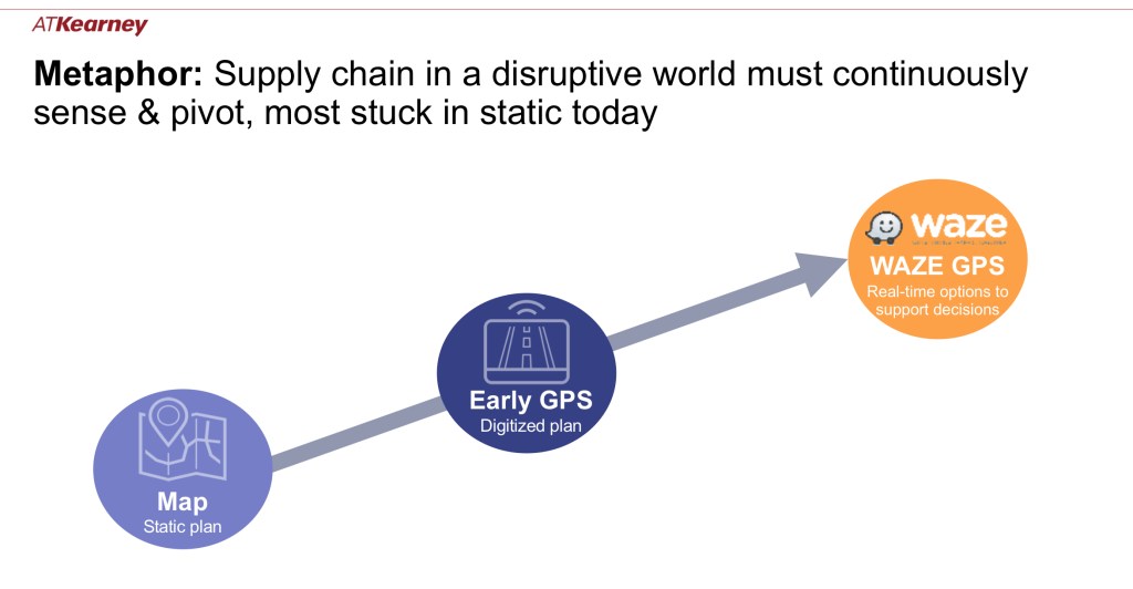Early GPS systems were essentially a digitized map that led you through a pre-determined route faster and with greater ease than a paper map. But as early GPS could not account for traffic jams, road hazards, or other unplannable variables, it did not tell you when or how to pivot. If you simply digitize your supply chain, you will face similar limitations. You may achieve great improvements in speed and efficiency, but your supply chain is still not built to nimbly adapt.