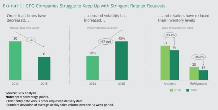 CPG companies are finding it much harder to forecast demand and stock the right inventory at the right location. In addition, retailers are actively reducing their own inventory levels but putting pressure on their CPG suppliers to hold more. This allows them to restock their shelves quickly and keep orders flowing.