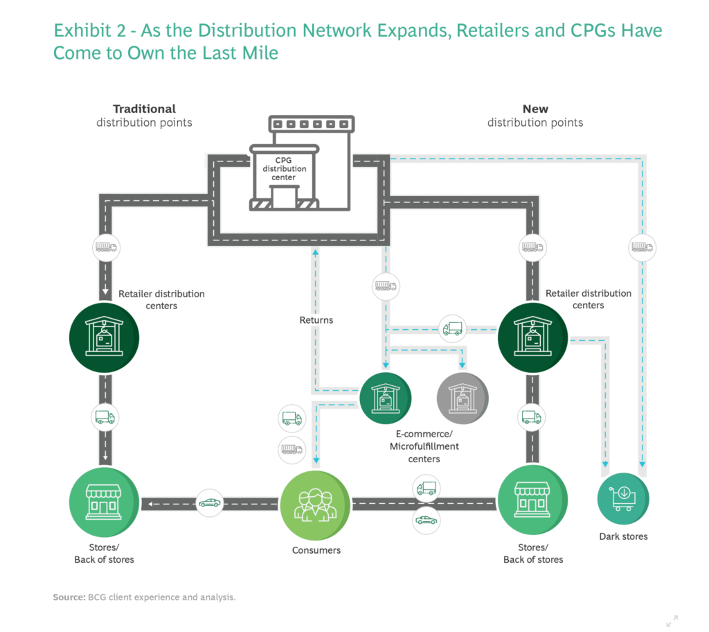 For decades, CPGs designed their retail supply chains for full trucks and full pallets. Goods left their distribution centers, destined first for the retailer’s distribution center and then for retail stores. Today, the last mile is the responsibility of the retailer, the peer-to-peer delivery startup, or even the CPG. Thus, in a relatively short period, companies have gone from a few deliveries per week to a handful of retailer distribution centers to almost daily deliveries to hundreds of fulfillment centers and dark stores. (See Exhibit 2.)