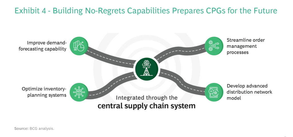 Forward-looking companies from across CPG sectors are pursuing four no-regrets moves, integrated through the central supply chain system. (See Exhibit 4.)